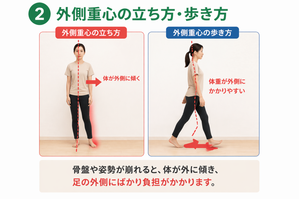 これらが積み重なると、重心が外側へ逃げてしまい、無意識のうちに靴の外側を削るような歩き方になってしまうのです。