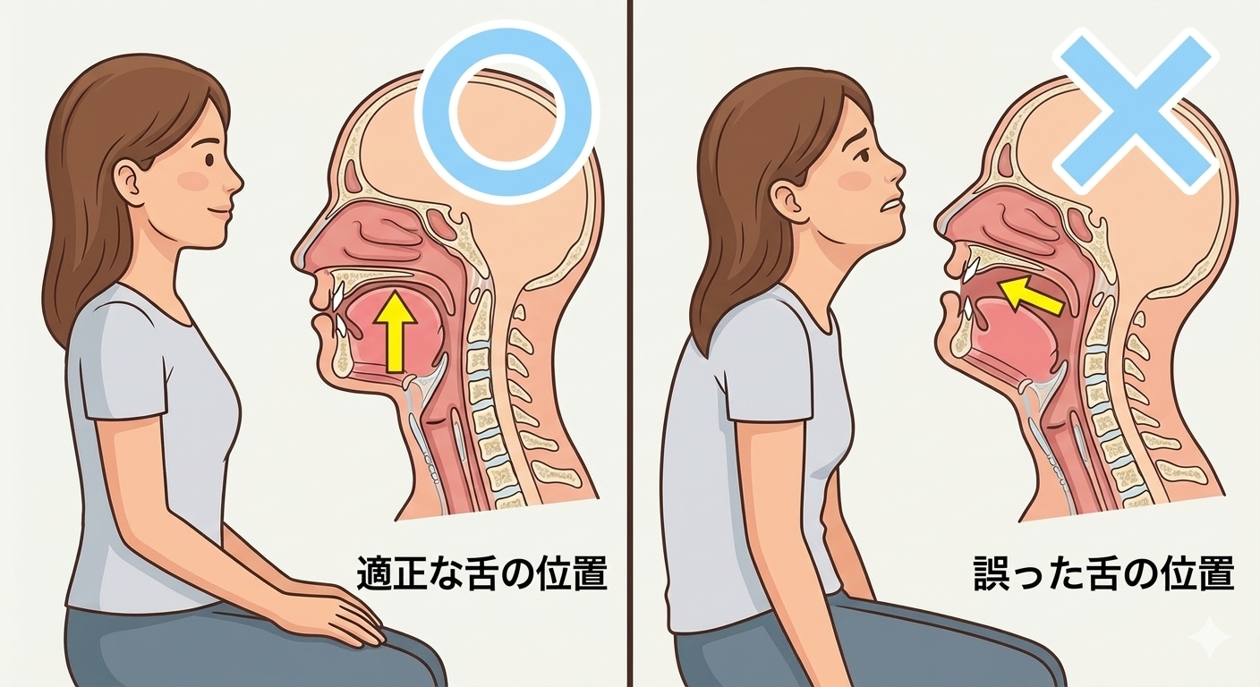 本来、舌は上顎(あご)の裏側にぴたっと吸い付いているのが正常です。しかし、姿勢が崩れて顎が上がると、舌は重力に従って下に落ち、喉の奥を塞ぐ位置に停滞します。
