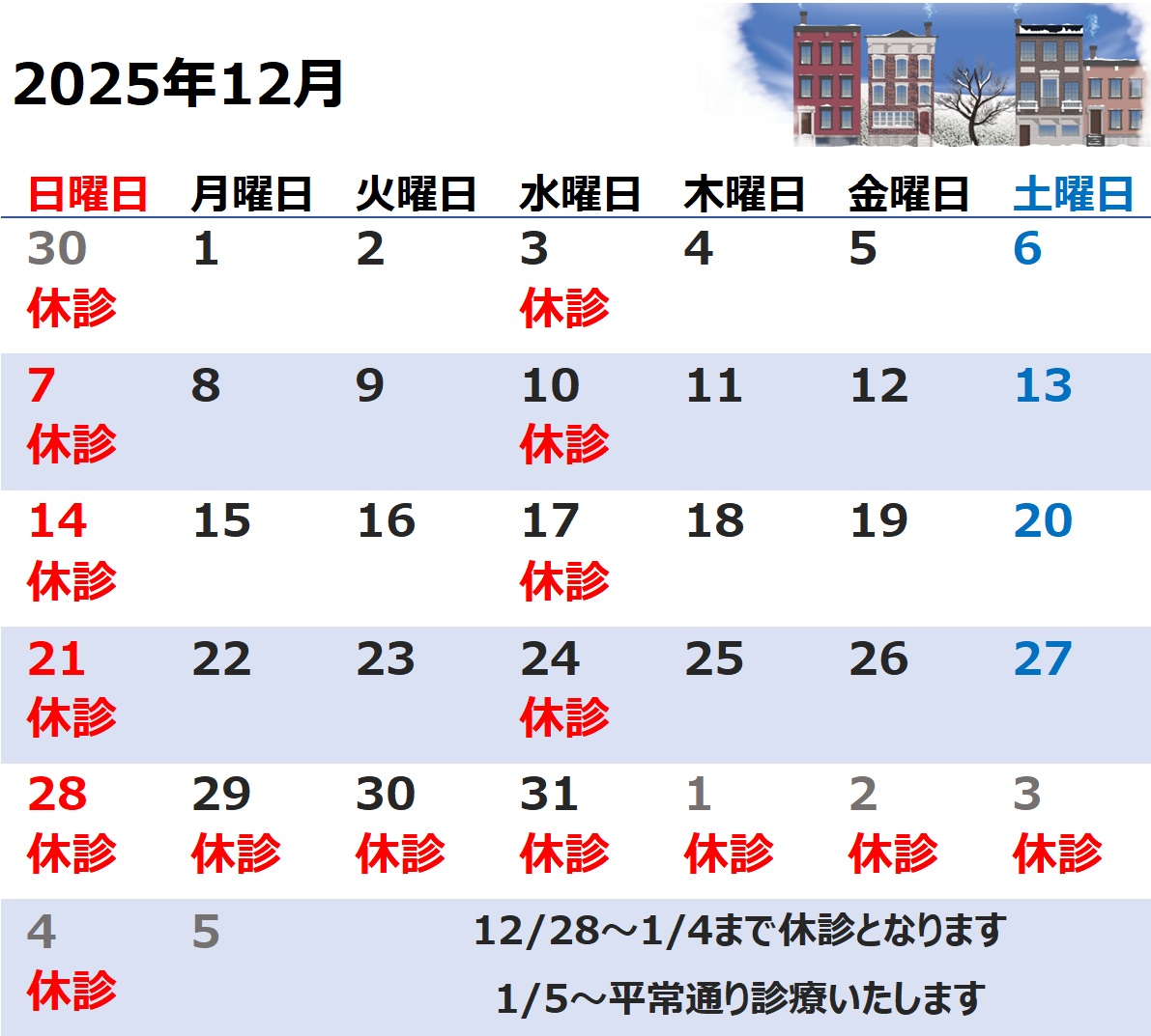 12/28(日)~1/4(日)はお休みをいただき1/5(月)から診療いたします。