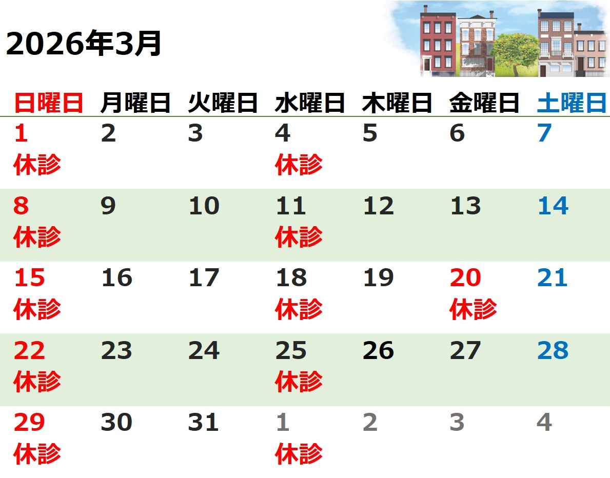 3/1(日)3/4(水)3/8(日)3/11(水)3/15(日)3/18(水)3/20(金)3/22(日)3/25(水)3/29(日) 上記日程が休診日となります。 ご迷惑をおかけしますが何卒よろしくお願いいたします。