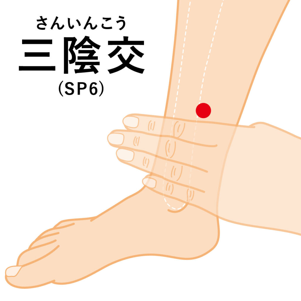 - 三陰交(さんいんこう):足の内側にあり、女性特有の血流やホルモンバランスを整えるツボ。