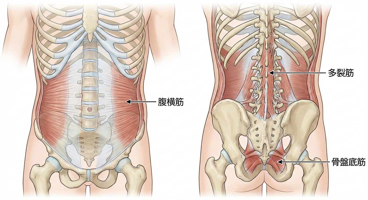 ②骨盤を安定させる筋肉(特に骨盤底筋群・腹横筋)を再教育すること